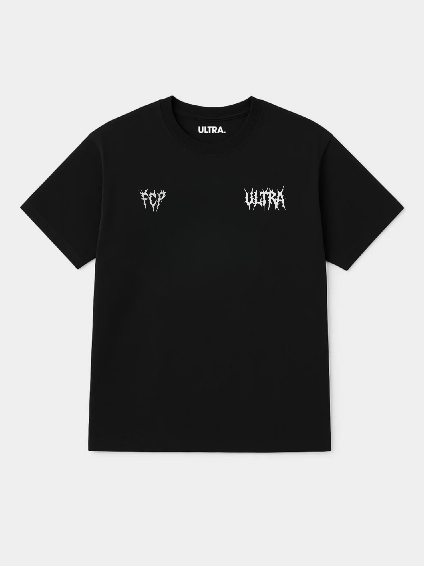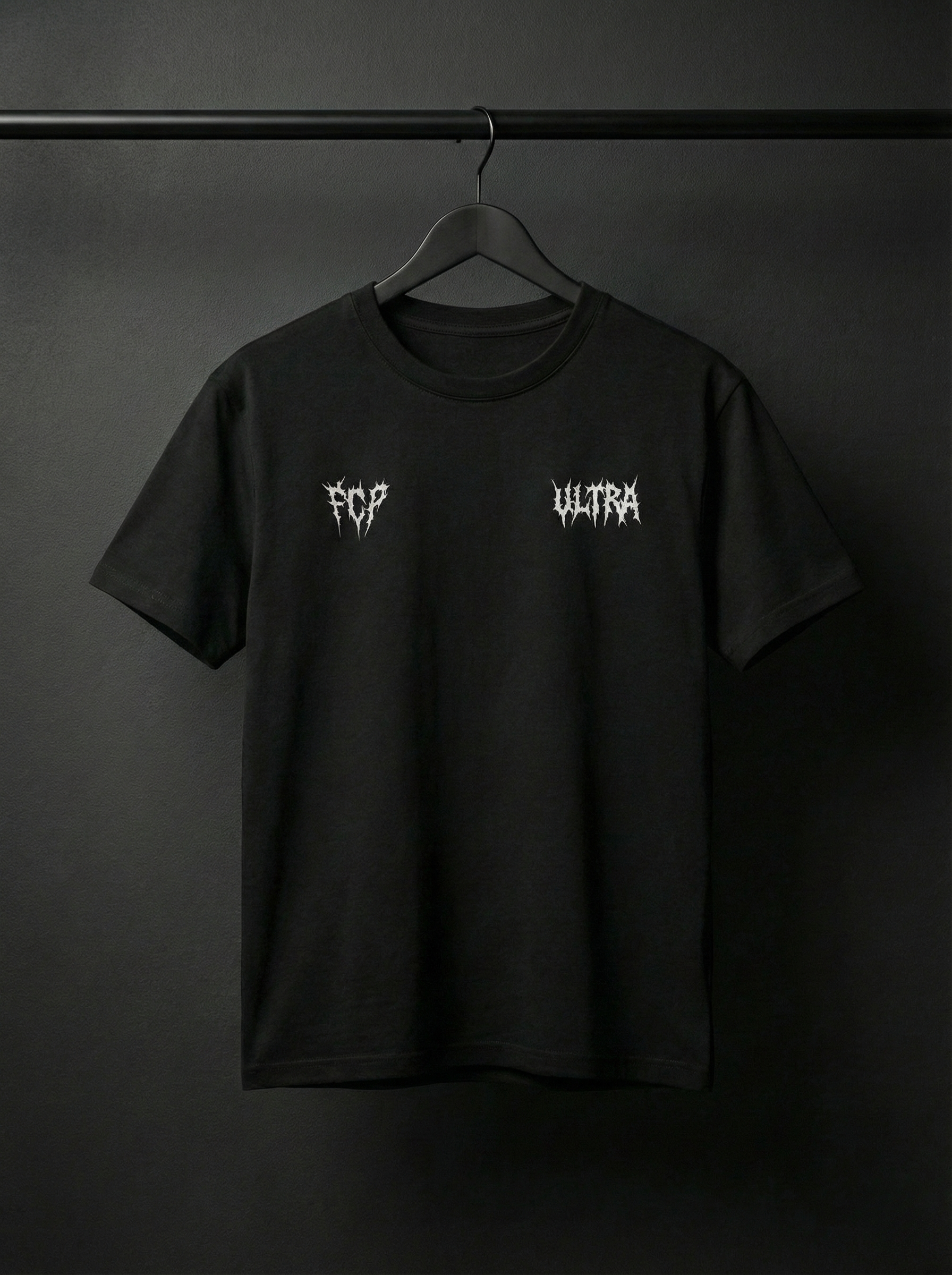 Con un fondo completamente negro, el diseño resalta los elementos esenciales de la tipografía metálica: "FCP" a la derecha y la actitud "ULTRA" estampada a la izquierda. Limpio, directo y sin recarga visual en la parte posterior.