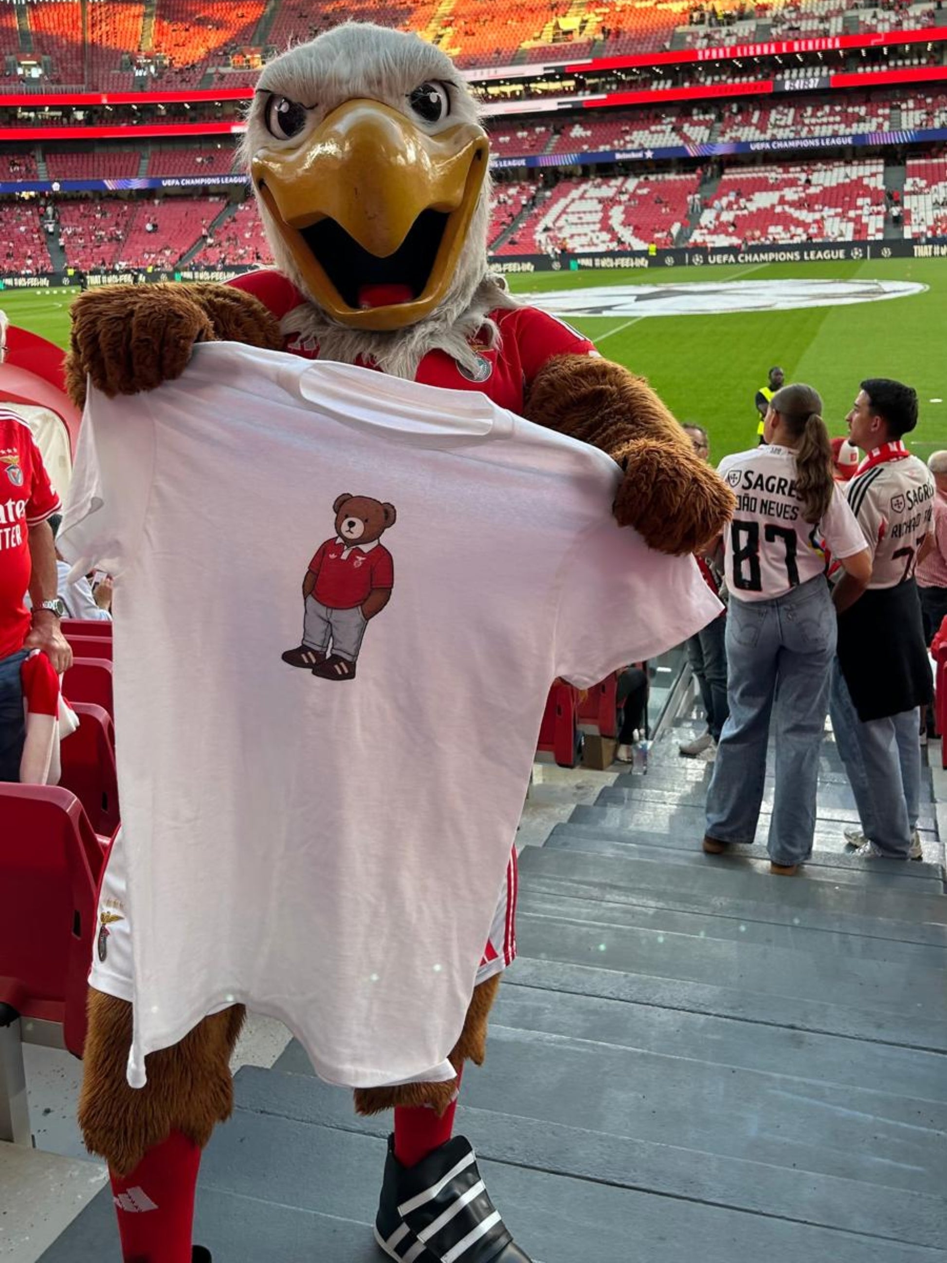 No centro, um urso destemido veste a camisola vermelha do SL Benfica — símbolo de garra, lealdade e presença em cada bancada do Estádio da Luz.